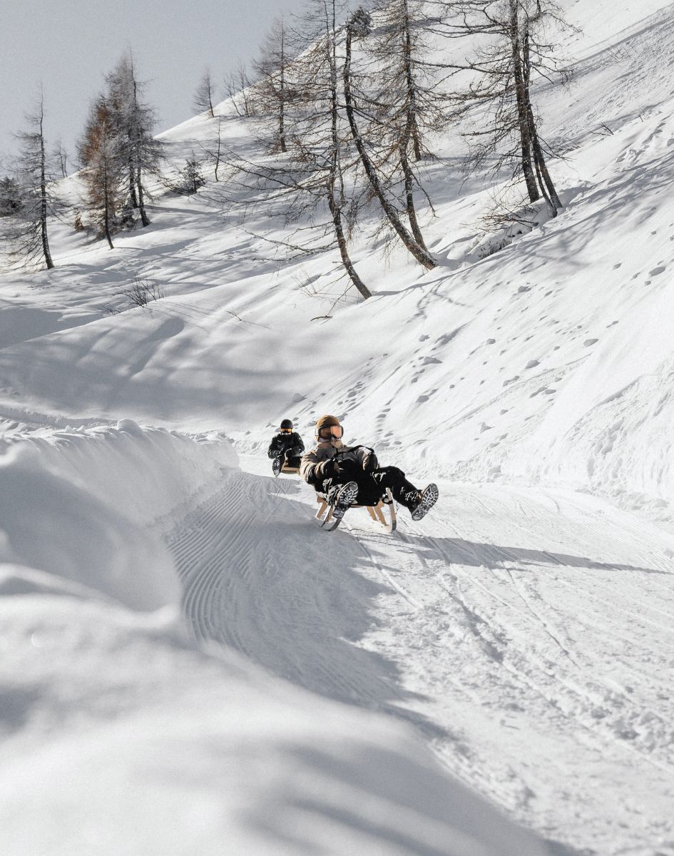 Was man im Schnee alles machen kann: Spuren im Pulver ziehen, rasant abfahren, mit der Rodel ins Tal sausen, gemütlich durch den Winter wandern. Und Schneemann bauen sowieso.