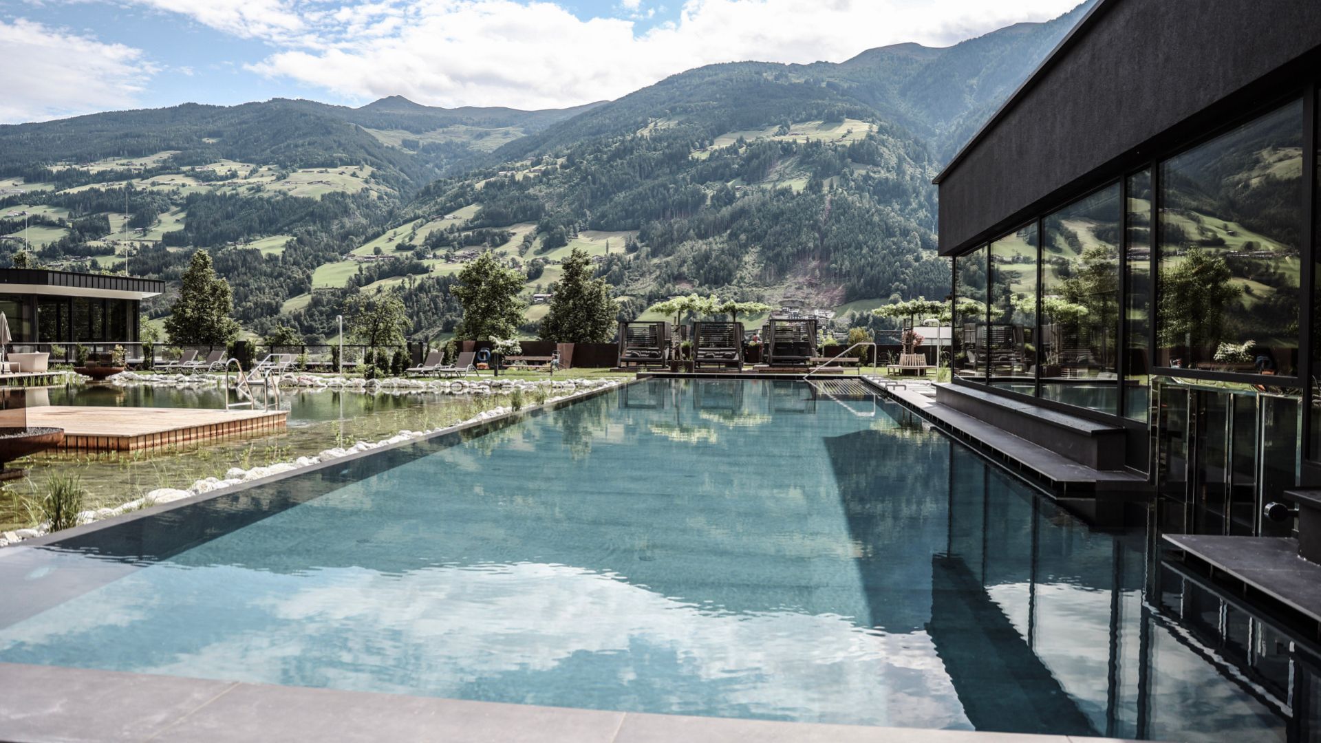 Between summit bliss and garden flair, for example, there are three light-flooded relaxation rooms, a bio sauna and a panorama sauna, steam bath, plunge pool, a saltwater relaxation pool, a cold chamber, bright beauty rooms, a phenomenal sports pool with 25 meters of uninhibited swimming pleasure, a cosy indoor pool and, above all, lots of peace and quiet.