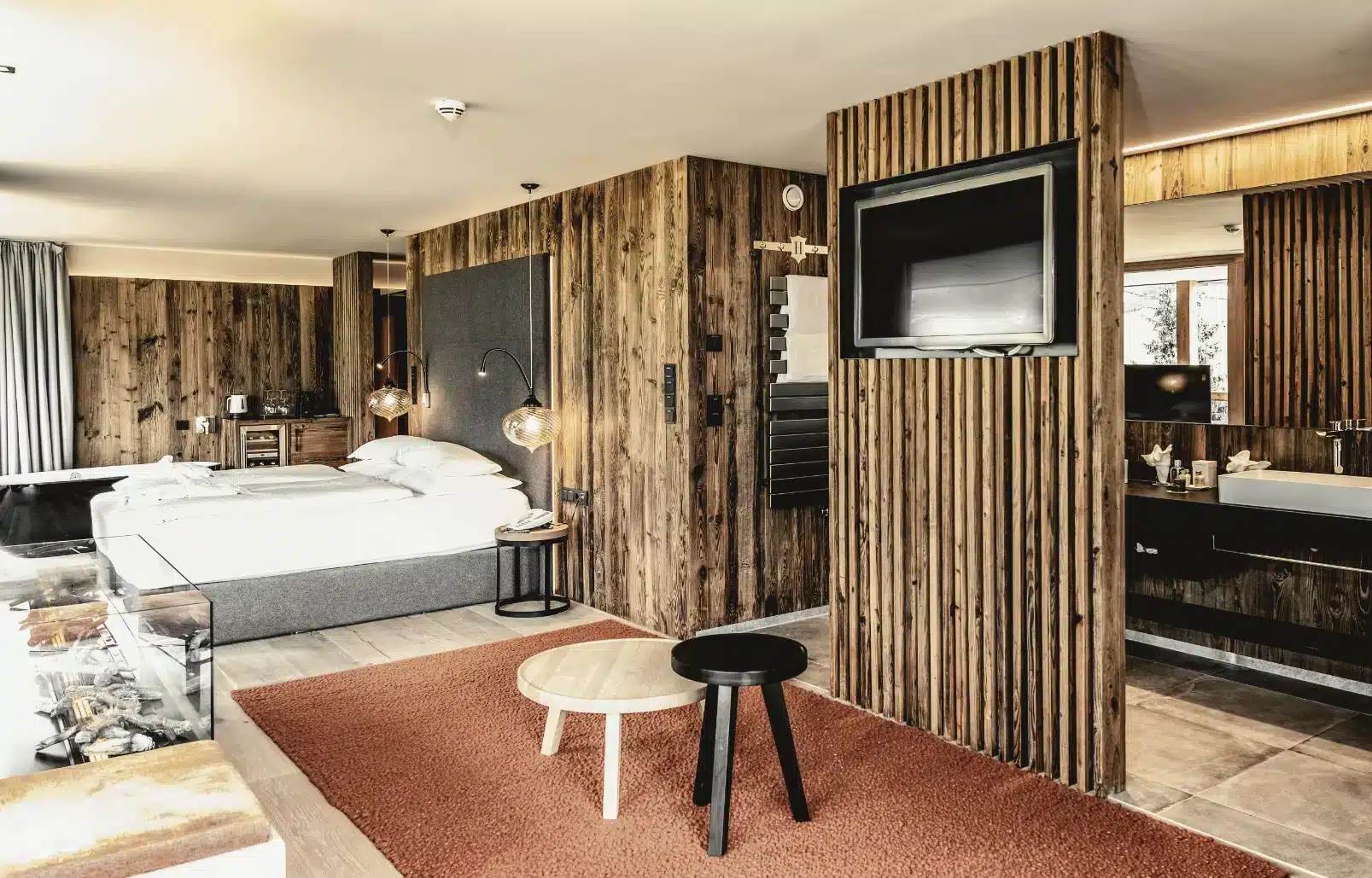 Panorama Suite Bergfeuer mit großer Terrasse, Eichen-Holzboden, Vollholzmöbeln, Box-Springbetten mit atemberaubenden Ausblick.